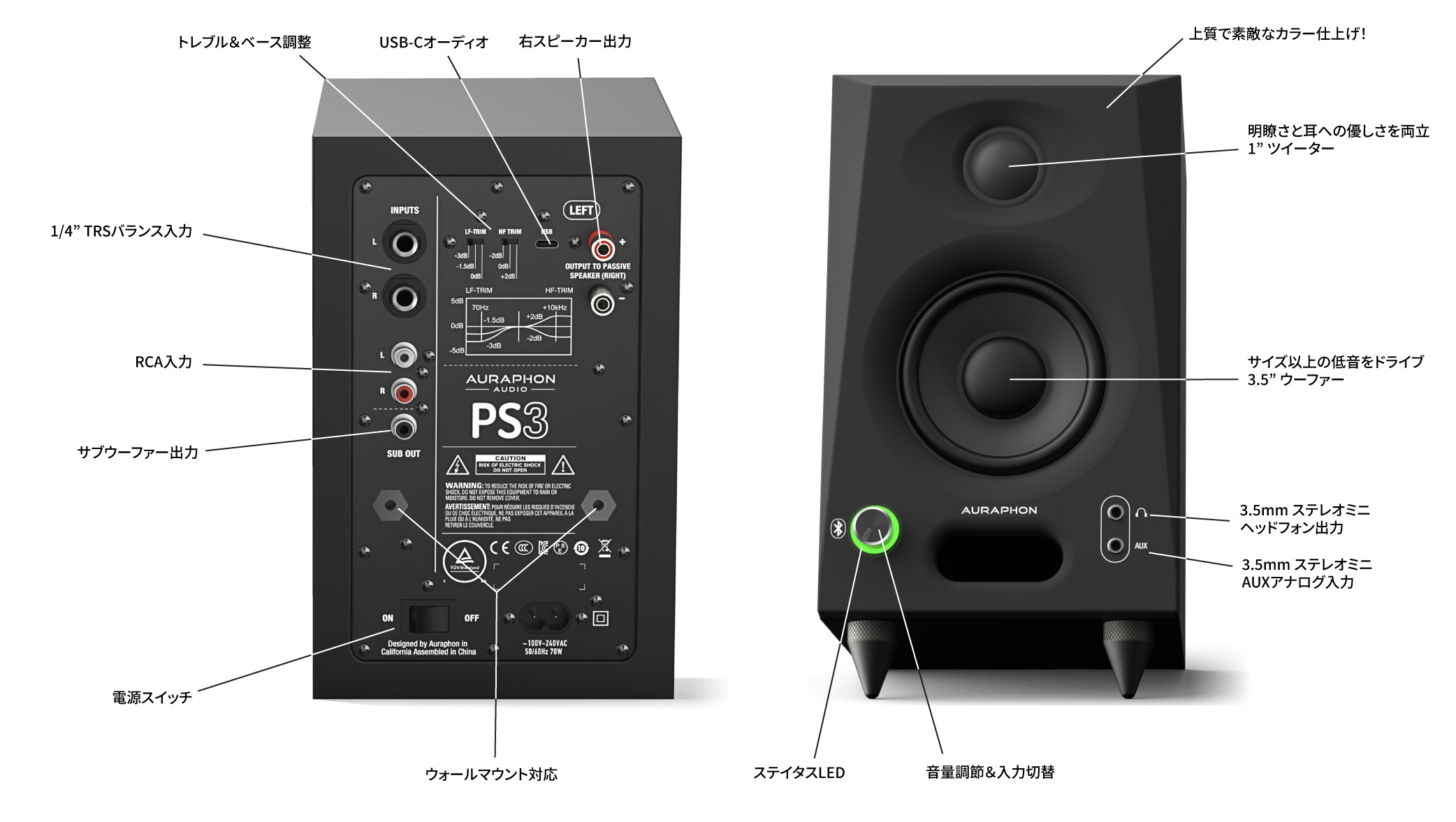 | 入力 | 1/8″ / 3.5 mm ステレオミニ, 1/4″ x2 LRステレオ独立, RCA LRステレオ独立, USB/Bluetooth |